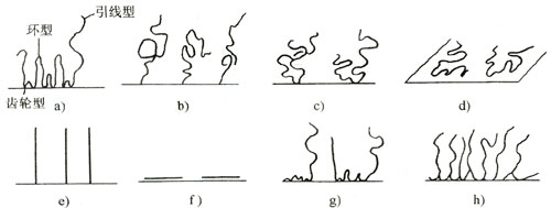 a )同聚物(环行、齿轮型、引线型) b )末端吸附(引线型) c )点吸附( 2 根引线型) d )平面状吸附 e) 刚性垂直链吸附 f )刚性链横卧吸附 g )左: AB 型 右: ABA 型块状聚合物的环型、齿轮型、引线型 h )接枝共聚物的齿型吸附