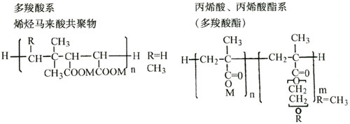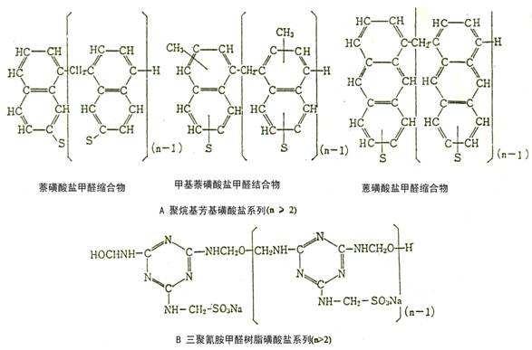 萘系( Naphthalin ),三聚氰胺系( Melamine ),氨基磺酸系( Aminosulfonic acid ),多羧酸系( polycarboxylic acid )。其化学结构式分别如下: 萘系 萘磺酸盐甲醛缩合物