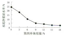 2.4 第四单体及用量对产品性能影响 传统的氨基磺酸盐系高效减水剂由对氨基苯磺酸钠 ( 也可用对氨基苯磺酸代替 ) 、苯酚和甲醛三种主要原料为单体,通过三元共聚,形成具有多支链的网状分子结构。其分子在水泥颗粒表面呈现立体吸附,使混凝土在较长时间内保持其坍落度及流动性。但由于其分子中疏水基链短、极性强,使其应用于混凝土时,会出现保水性差、易泌水现象。针对这—情况,根据“分子设计”原理,从改进传统氨基磺酸盐分子结构入手,加入含有聚氧乙烯基 [CH 2 CH 2 O ) n H)] 的第四种单体 ( 即改性剂 ) 。该单体在碱性环境下,能与甲醛发生交叉的羟醛反应,生成 β —羟基酮,再与羟甲基化分子发生缩合,从而增长疏水基分子链,优化原分子结构极性,以增强混凝土保水、抑制混凝土泌水性。据此经反复多次试验后付诸实际生产,产品用于几个大的商品混凝土搅拌站高标号混凝土配制,取得了很好的效果。 试验表明,第四单体的掺加量并非越多越好。经合成试验与产品检测,按第四单体占 ( 对氨基苯磺酸钠 + 苯酚 ) 质量百分比来表示,第四单体的掺加量与产品性能关系如图 2 、图 3 所示。