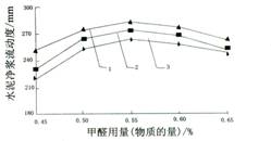 2.3 甲醛用量对合成产物的影响 甲醛分子中的羰基是强极性基团,化学性质比较活泼,易发生亲核加成反应。受羰基影响,甲醛的 α -H 也具有较强的活性,加上酚羟基邻、对位上的氢也较为活泼,使得苯酚很容易受甲醛进攻而羟甲基化。由于甲醛的用量直接影响苯酚的羟甲基化程度和类型,进而决定单体缩合分子量大小和支链多少,因此甲醛用量 ( 占总反应单体的物质的量 ) 对产物的分散性有很大影响。笔者通过多次试验,保持对氨基苯磺酸钠和苯酚用量相对固定,依次增加甲醛用量,其产物净浆流动度变化值如图 1 所示。