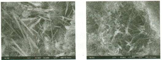 5 . 2 实验结果与讨论 从图 7 可见: SR 改性后,混凝土 7 天龄期形貌结构变的更加致密。改性前试样中的水化产物,针、柱状钙矾石发育不是很好,相互搭接不够紧密呈松散分布,没有和 C-S-H(C x SH x - 0.5 ) 凝胶形成密集体,有少量的孔洞,还有一定量的片状 Ca(OH) 2 呈零星分散。改性后,试样龄期水化产物中,柱状的钙矾石和 C-S-H(C x SH x - 0.5 ) 一定程度上变得紧密;和 C-S-H(C x SH x - 0.5 ) 凝胶形成簇状密集体,相互搭接后有被 C-S-H(C x SH x - 0.5 ) 凝胶包裹在里的趋势,形成了类似钢筋混凝土结构的趋势,互为连生,交叉,且孔隙变小,毛细孔径变小,凝胶与钙矾石紧密交织,孔隙比较规整,表面趋于平滑,六方柱状的水化铝酸钙及粒子聚集的云雾状 C-S-H 凝胶相互交织,互相搭接,出现了类似于石状纹理的结构体,是水泥石结构紧密的原因。致使抗压强度明显高于 7 天混凝土基准试样,强度物理实验也证实了这个结论。