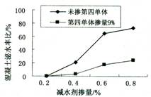 从图 4 、图 5 可以看出,掺加 9 %第四单体后的新型氨基系高效减水剂,水泥净浆 120min 内基本无损失,而萘系高效减水剂 120min 损失很大 ; 混凝土对比试验中,掺入第四单体后的新型氨基系高效减水剂,其混凝土泌水率也明显低于传统的三元聚合氨基系高效减水剂。