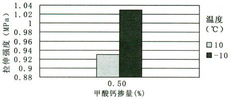 此试验将甲酸钙掺量为 0.5 %的抹灰砂浆分别在 l 0 ℃ 、- l 0 ℃ 的条件下养护 3d ,并在标准条件下养护 1d ,测量砂浆与水泥板的粘结强度,如图 5 。