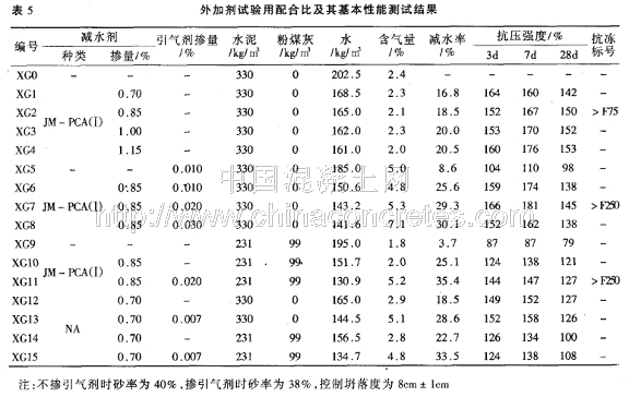 表5给出了外加剂本体性能试验用配合比及基本性能和抗冻标号的测试结果,从外加剂本体的基本性能测试结果可以看出: