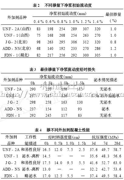 外加剂:对比山西、北京、湖北共5 家外加剂厂生产的UNF- 2A、UNF - 1 、J G- 2 、ADD - NS、FDN - 1 等5 种萘系高效减水剂,最后根据性价比原则选定北京某外加剂厂生产J G - 2 型外加剂,对比试验情况如下: