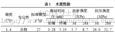 水泥:采用公开招投标方式采购,招标书中明确规定C3 A 含量不大于8 % ,碱含量0. 4 %~0. 6 %。通过对比,武汉亚东水泥有限公司生产的P ·O42. 5 水泥中标,水泥部分性能见表1 。
