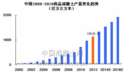 根据“十二五”水泥企业产业战略发展方向显示,水泥企业发展混凝土产业是完善产业链、降低市场风险、实现可持续发展的必然举措,也是水泥企业发展的必由之路。近几年,中小企业资金压力的增大,预拌混凝土集团化趋势明显,年产300万方以上的混凝土企业数量增长迅速。据中国混凝土网不完全统计,2012年中国商品混凝土产量达18.1亿立方米,同比增长了17.10%,市场总体规模有所扩大。