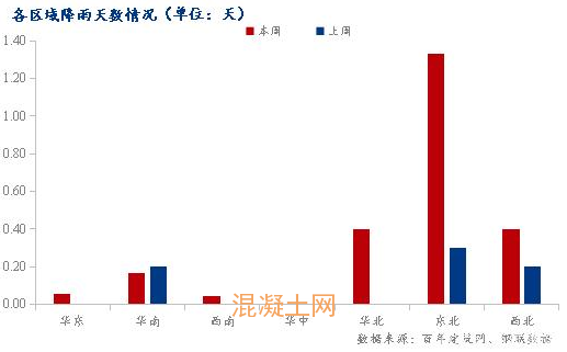 根据当周影响混凝土产量的降雨天数来看,本周影响混凝土出货量的平均降雨天数不足1天。各地区近期受雨水天气影响较小,搅拌站出货情况本周与天气因素关联性不大。随着寒潮天气影响逐渐扩大,预计后期工程进度会有所放缓,本周东北地区暴雪天气明显增加,混凝土出货量大幅降低。