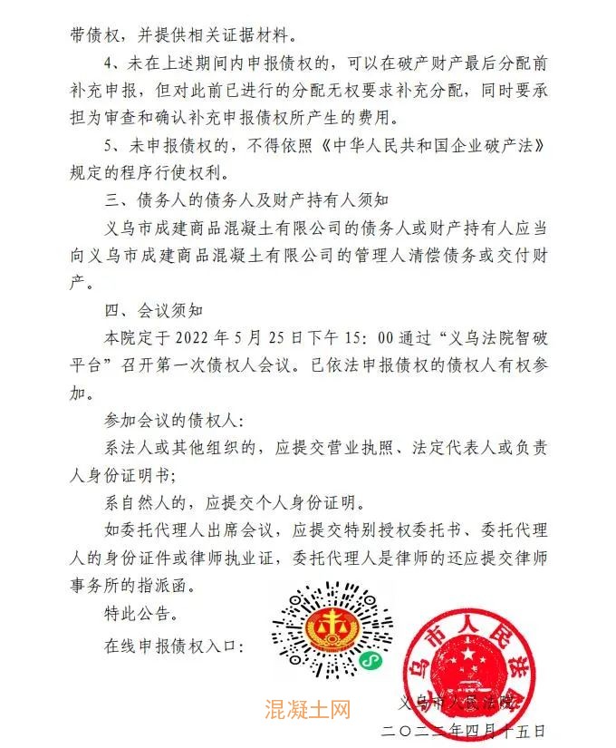 而在2022年4月15日,浙江省义乌市人民法院就发出公告,根据申请人陈林正的申请,于2022年4月11日裁定受理义乌市成建商品混凝土有限公司破产清算一案。