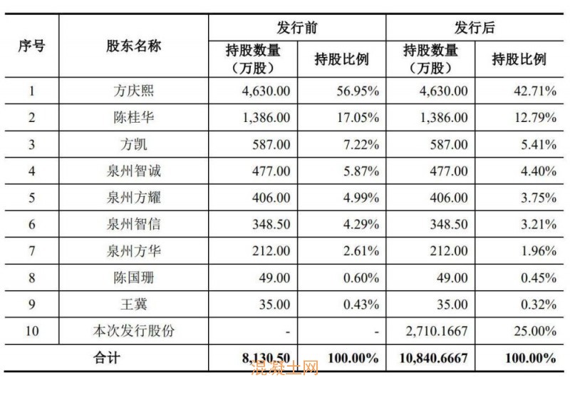IPO前,方庆熙持股为56.95%,陈桂华持股为17.05%,方凯持股为7.22%,泉州智诚持股为5.87%,泉州方耀持股为4.99%,泉州智信持股为4.29%,泉州方华持股为2.61%,陈国珊持股为0.6%,王冀持股为0.43%。