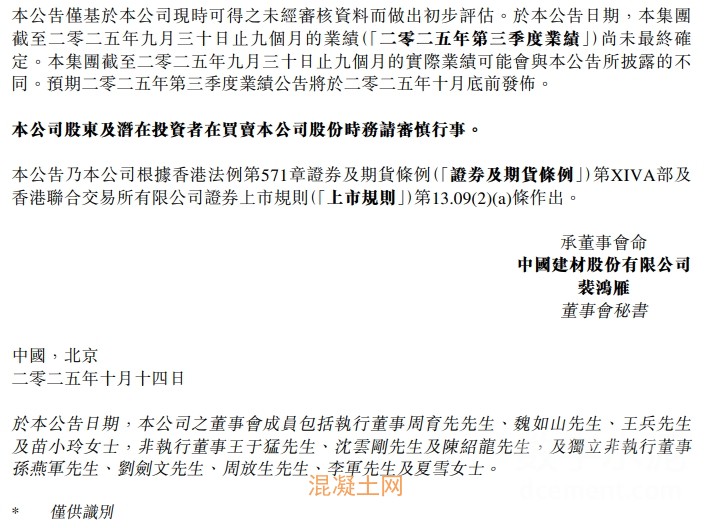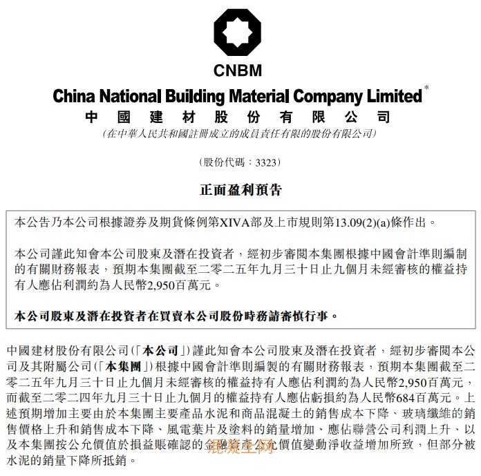 中国建材(03323.HK)发布公告,预期集团截至2025年9月30日止九个月未经审核的权益持有人应占利润约为人民币29.50亿元,而截至2024年9月30日止九个月的权益持有人应占亏损约为人民币6.84亿元。