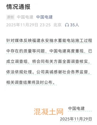 11月29日晚,中国电力建设集团有限公司(以下简称“中国电建” 601669.SH)针对媒体反映的福建永安抽水蓄能电站施工质量问题,通过官方渠道发布情况通报,宣布已成立专项调查组,将联合有关方面全面调查核实,并承诺依法依规处理。