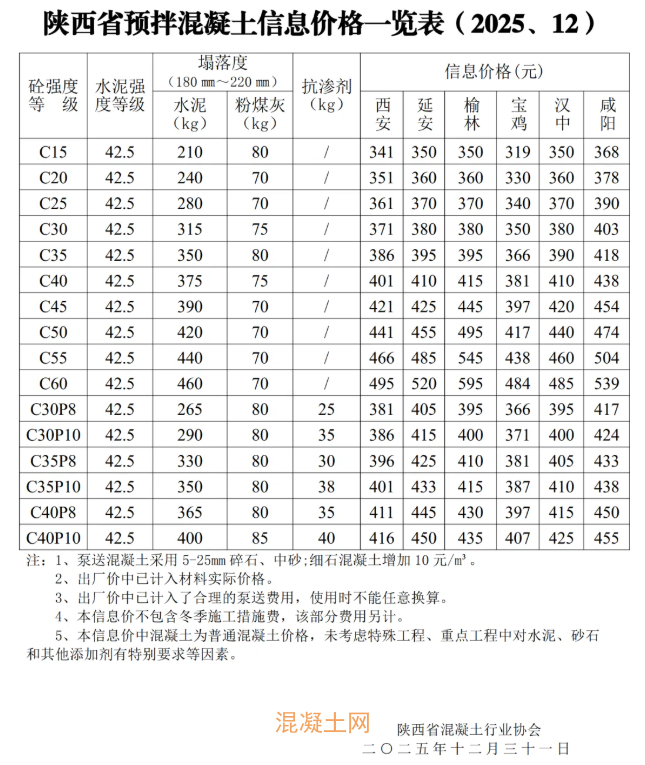 陕西省预拌混凝土信息价格一览表(2025、12)