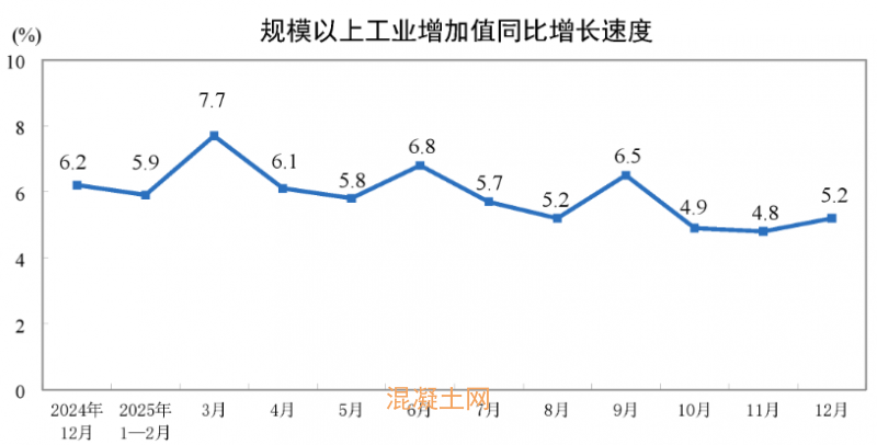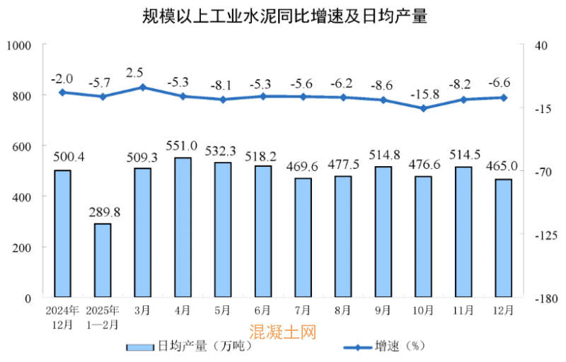 据国家统计局最新数据显示, 2025年12月份,规模以上工业增加值同比实际增长5.2%(增加值增速均为扣除价格因素的实际增长率)。其中,水泥14416万吨,下降6.6%。2025年,规模以上工业增加值比上年增长5.9%。1-12月水泥产量169314万吨,同比下降6.9%。