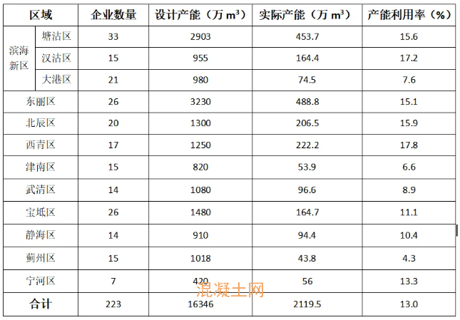 通过上表分析,目前天津市预拌混凝土行业产能过剩问题依然严峻,截止2025年12月底,天津市混凝土行业年设计生产能力 16346万立方米,同比减少2.5%。全市2025年度预拌混凝土企业共生产供应各等级混凝土 2119.5万m³,比去年同期下降4.8%,下降幅度低于全国平均水平,天津混凝土市场受产业结构调整保持充分的韧性;天津市混凝土行业平均产能利用率13%,仍低于全国平均水平。其中产能利用率最高的区域为西青区为17.8%,仍低于去年同期水平21%。产能利用率最低的为蓟州区仅为4.3%,相比去年同期水平仍在下滑。大港区、津南区、武清区产能利用率均不足10%。东丽区搅拌站产能总量继续领跑其他区域,蓟州区产能总量最低。天津市环城四区域普遍高于其他区域,四区合计产能占比天津市总产能47.3%;滨海新区生产企业总数量有所降低,其中塘沽区和汉沽区本年度混凝土方量高于去年同期。