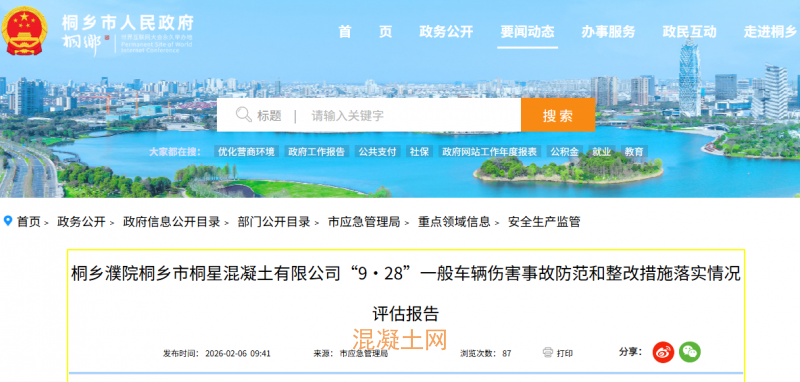 近日,桐乡市安全生产委员会办公室发布桐乡濮院桐乡市桐星混凝土有限公司“9·28”一般车辆伤害事故防范和整改措施落实情况评估报告。桐乡市安委办组织成立由市应急管理局、市纪委监委、市公安局、总工会、市交通运输局等相关部门人员组成的事故检查评估组,于2026年1月23日对桐乡市桐星混凝土有限公司“9·28”一般车辆伤害事故防范和整改措施落实情况开展评估,评估情况通报如下: