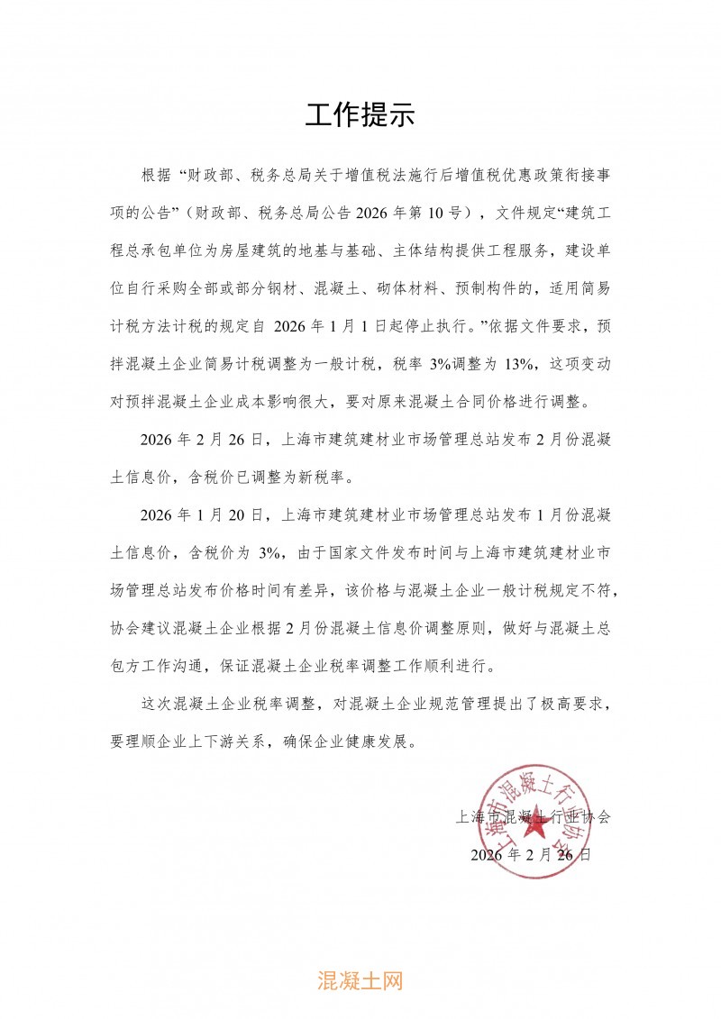 上海市混凝土行业协会发布“预拌混凝土企业税率调整工作提示”