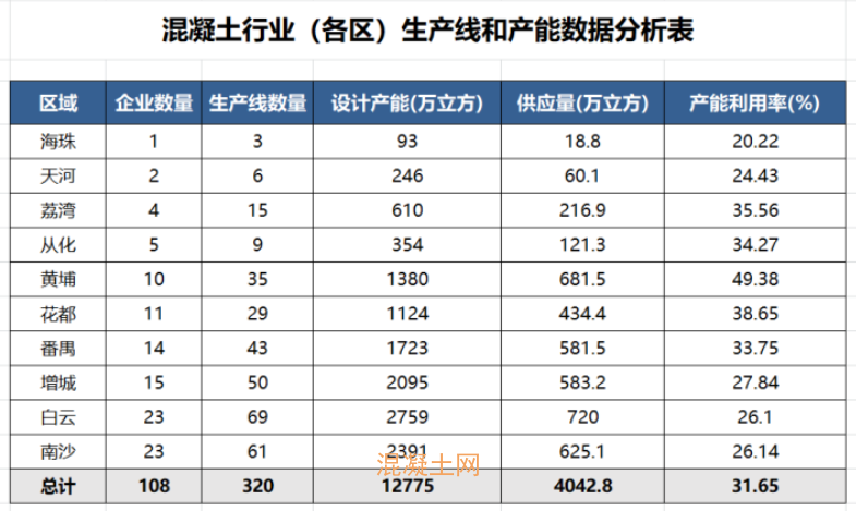 目前108家企业共拥有生产线合计320条,根据国家中散协关于预拌混凝土生产线设计产能统计公式计算,全市混凝土行业的设计产能折算是12775万立方,与2024年相比较产能增加了5.2%。其中白云、南沙区的企业数量、设计产能较大,混凝土生产线数量分别为69和61条。