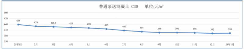 行业竞争激烈导致混凝土的销售价格不断下调,参考广州市建设工程造价管理站公布的混凝土月度综合价格,以C30普通泵送混凝土的税前综合价格均值为例,2025年1月份价格为438元/立方,同年12月份价格为392元/立方,每立方价格直接下调了46元,下调幅度为10.5%。市场实际的结算价格以综合价格为基础下浮,不同区域的下浮幅度也不一样,一般情况下下浮幅度区间在18%~25%,个别项目的下浮超过25%。