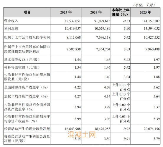 核心提示:海螺水泥(600585)3月24日晚间披露2025年年度报告。2025年,公司实现营业收入825.32亿元,同比下降9.33%;归母净利润81.13亿元,同比增长5.42%;扣非净利润75.88亿元,同比增长3.03%;基本每股收益为1.54元。公司2025年度分配预案为:拟向全体股东每10股派现6.1元(含税)。