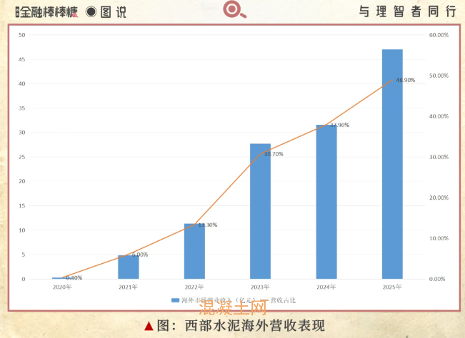 年报数据显示,2025年,西部水泥营收96.21亿元,同比增长15.3%,创历史新高;其中海外市场营收47.01亿元,同比增长48.7%,占整体的48.86%,成为增速主要贡献者;净利润为8.80亿元,同比增长40.5%,其中80%由海外板块贡献。