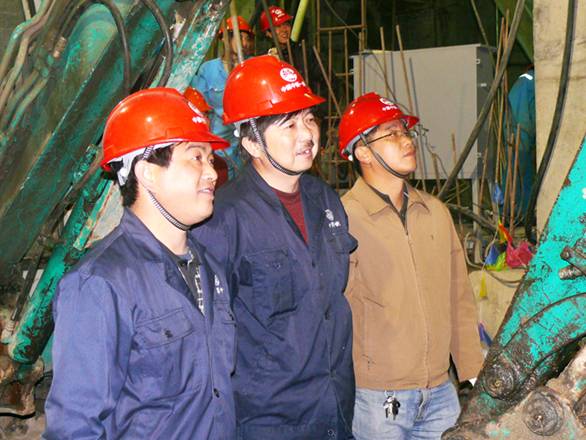 项目经理曾益平、盾构队长马新生及项目副经理李新红看着盾构刀盘露出后展现出喜悦的笑容