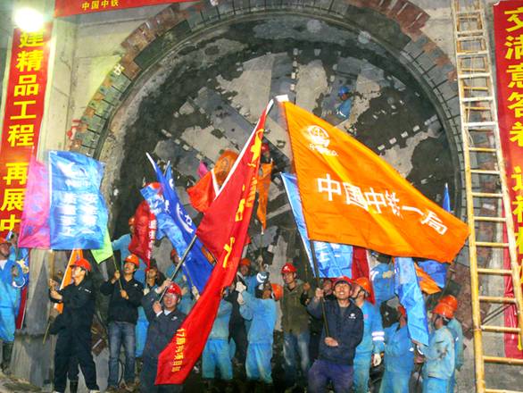 盾构露出刀盘后施工人员举彩旗欢呼情景