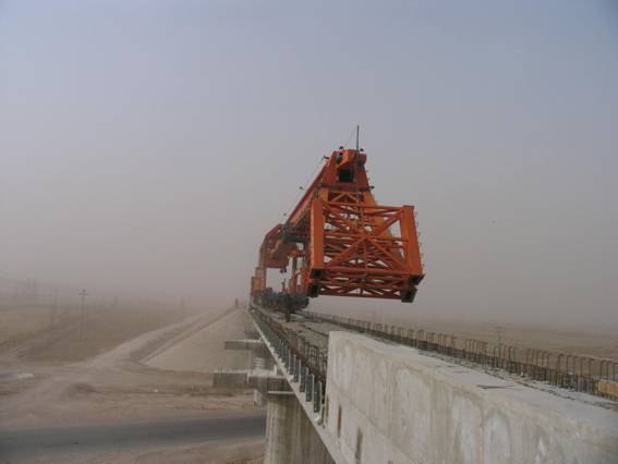 架桥机冒着风沙前进
