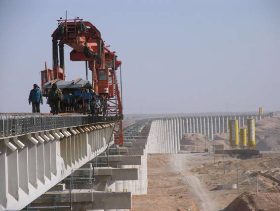 4月27日10时,新运公司太中银项目部在茫茫戈壁滩辛家湾子特大桥上徐徐落下全线第1000孔桥的最后一片梁,这标志着太中银项目部施工生产在全线突破架梁1000孔大关, 架梁进度在太中银铁路遥遥领先。