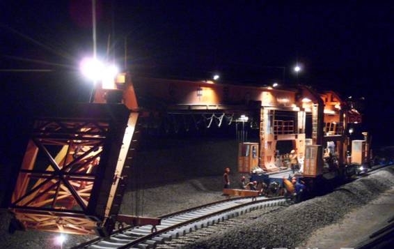 新建铁路太中银站前Ⅴ标(靖边~中宁东)线路全长287.921 km,架梁763孔,新铺正线392.275km,站线铺轨35.624km,铺设道岔130组,其中正线铺岔80组,上碴121万m3,铺碴整道392.275km,并一次性铺设60kg/m无缝线路。