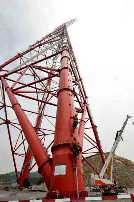 在孤立海岛上,如何抗拒超强台风的袭击,确保线路和国际航道的安全,成为建设者们首要解决的重大课题。根据计算,高塔的一个基础,在正常运载情况下,其风荷载将高达千吨,而铁塔本身的重量更是接近六千吨,常规的设计施工根本无法满足安全要求。面对前所未有的挑战,建设者们大胆而谨慎的采用中空夹层钢管混凝土结构,在212米以下主管内放置小管,并采用混凝土浇注加以固定。为保证主管内混凝土浇筑质量,浙送人采用泵送导管浇灌法,按塔身结构形式,共分八个浇灌段,与高塔组立间隔进行。他们采用高流态自密实高性能补偿收缩混凝土,控制混凝土坍落度;采用导管法,实现浇筑段混凝土的不间断自顶升;投料全部采用电脑计量,搅拌站采用微机控制系统,保证计量准确性。