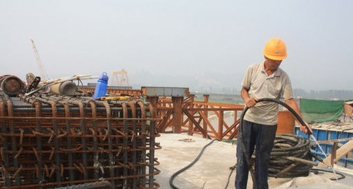 7月28日,一名工人顶着烈日在郑(州)焦(作)城际铁路黄河特大桥刚浇筑的69#主墩上浇水,认真地进行着墩身混凝土养护作业。截至目前,京广、郑焦线并行的主桥墩已完成了4座,预计主桥基础及下部结构年底前全部完成。
