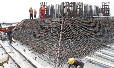 为了解决主墩承台浇筑大体积混疑土散热难关, 项目部通过技术攻关, 在承台内安装了5层冷却水管系统装置, 通过水的循环冷却作用化解大体积混凝土浇筑施工时产生的巨大热量。该承台下有40根直径2.5米、平均长41米的钢筋混凝土钻孔浇注桩基础。