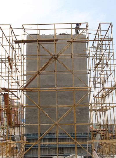 中朝鸭绿江界河公路大桥长3030.4米;引桥全宽为2×13.75米;主跨径636米,满足双向通航398米,净高30.5米。桥梁设计荷载采用公路—Ⅰ级。索塔为“H”型,索塔总高度197m,全桥共44个墩台, 为实心和空心薄壁墩, 整体造型 与主梁协调,轻巧美观。墩身模板采用桁架式整体精加工模板,采用C40混凝土,分两次浇筑。为了确保工地第一墩诞生后能成为标准工程、示范工程、承担施工任务的TJSG-2标项目部克服了重重困难,精心组织,精心施工。为了确保工程质量万无一失,大桥项目指挥部多次召开专题会议,组织技术攻关,浇筑了试验墩,进行了首件检验。为了确保外观平整光滑,桥墩模板采用透水布新工艺。并制定了墩身施工方案,对施工工序进行了周密而详细的技术交底。