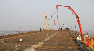 中朝鸭绿江界河公路大桥引桥采用箱梁现浇施工,13—14号墩为60米现浇箱梁。为了确保首片箱梁浇筑成功,项目部专门编制了《中朝鸭绿江界河公路大桥60米箱梁施工方案》,为了攻克箱梁高性能混凝土配合比和外观技术难关,项目部专门成立了技术攻关小组,在反复试验中总结出了混凝土最佳配合比和最好施工工艺,攻克了施工技术难关,使桥梁质量达到了内实外光的效果。为了确保施工安全,在支架安装完成后,专门进行了预压试验。为了确保第一孔箱梁顺利浇筑施工,在箱梁钢筋绑扎完毕、立好模板后,项目部浇筑了试验粱段,指挥部专门组织有关人员对其进行了首件检验。浇筑前,项目部又专门对全体参加施工人员召开了安全和技术交底会。此次浇筑成功的桥梁为单室单箱60米斜腹板截面,采用C50高性能混凝土,双向预应力混凝土连续箱梁,满铺支架浇筑施工。箱梁顶宽13.85米,箱室底宽5.824米,外侧翼缘板长3.25米,梁高3.5米。该箱梁设计新颖、技术先进,棱角分明,线条流畅,达到国内同类桥梁建设先进水平。